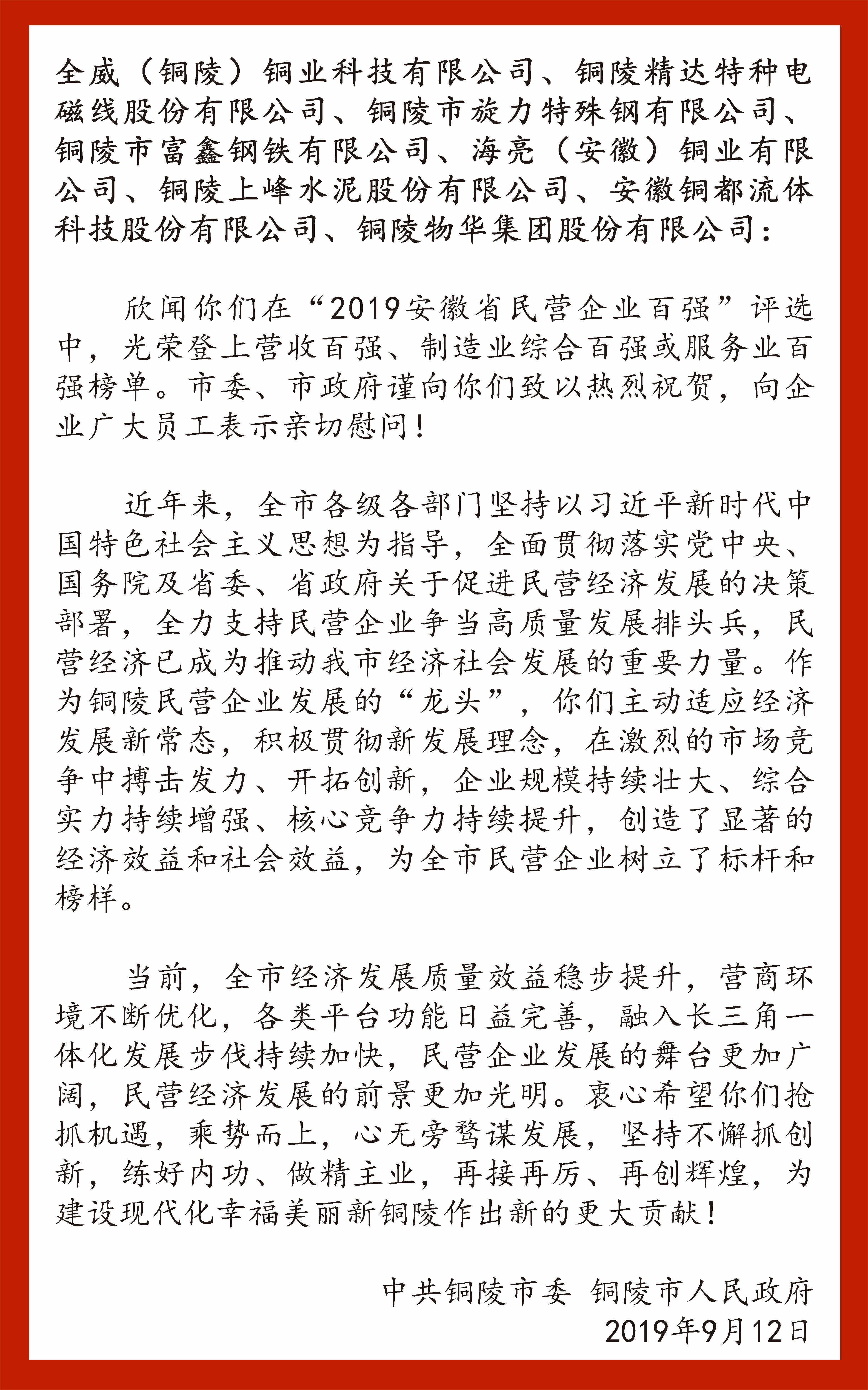 9月12日,在中秋佳節(jié)即將來臨之際,中共銅陵市委、銅陵市政府對銅都流體榮登“2019安徽省民營企業(yè)百強”榜單致以熱烈祝賀,對企業(yè)員工表示親切慰問!