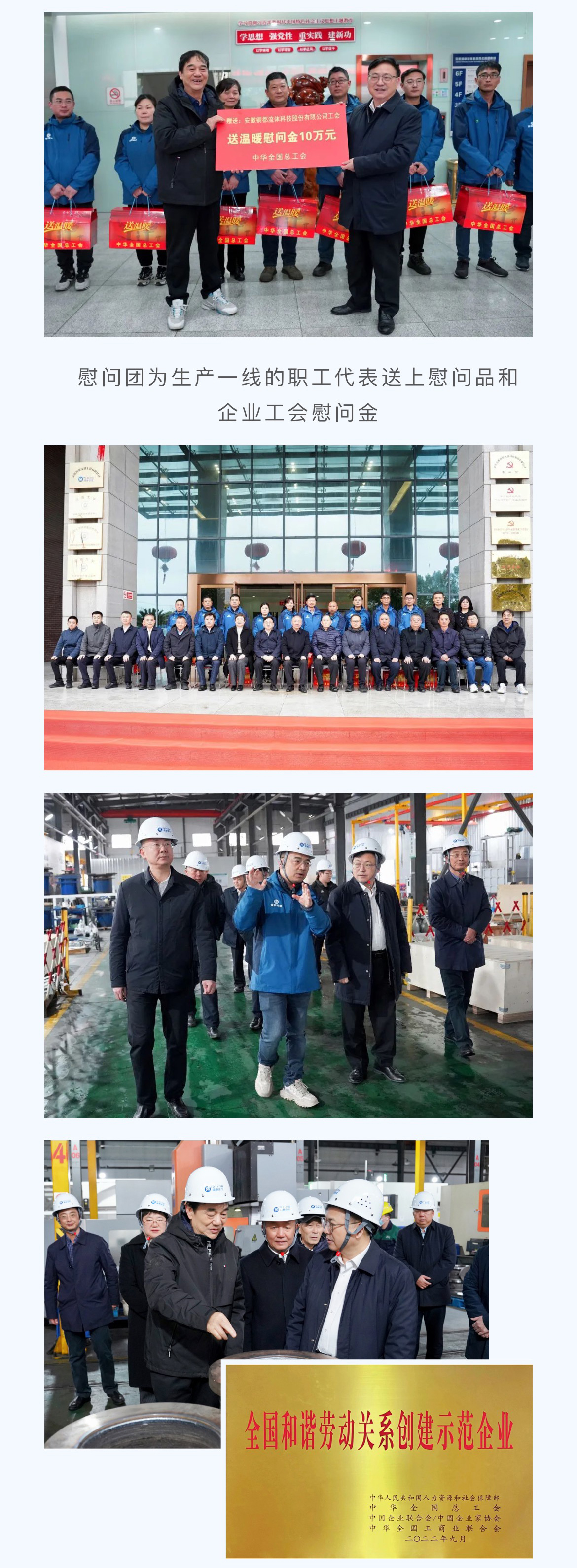 慰問團一行對銅都流體獲得“全國和諧勞動關(guān)系創(chuàng)建示范企業(yè)”榮譽作出充分肯定,并在董事長楊成、總經(jīng)理楊凌杰陪同下,前往生產(chǎn)現(xiàn)場,看望奮戰(zhàn)在生產(chǎn)一線的職工代表,為他們送上慰問品和企業(yè)工會慰問金,詳細了解企業(yè)生產(chǎn)經(jīng)營和工會工作情況,指出企業(yè)工會組織要切實發(fā)揮作用,圍繞企業(yè)生產(chǎn),積極開展各類勞動競賽和技能素質(zhì)提升活動,為職工的成長成才搭建廣闊舞臺,鼓勵廣大職工要充分發(fā)揮工人階級主力軍作用,用辛勤的勞動創(chuàng)造美好的生活,為推進中國式現(xiàn)代化貢獻自己的力量。