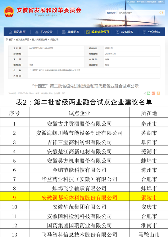 日前,安徽省發(fā)改委公示了“十四五”第二批省級先進制造業(yè)和現(xiàn)代服務(wù)業(yè)融合試點名單,銅都流體成功入選“兩業(yè)融合”試點企業(yè)。