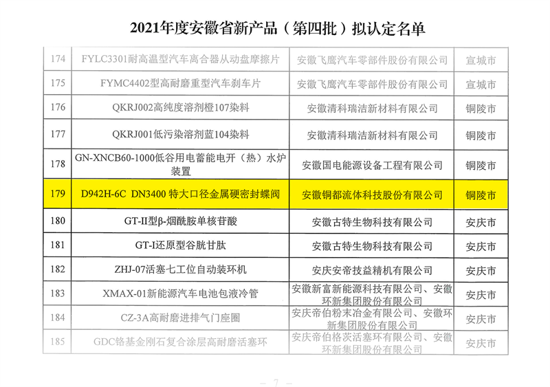 2021年,安徽省經濟和信息化廳組織開展了第四批安徽省新產品認定工作。銅都流體DN3400特大口徑金屬硬密封蝶閥,經專家評審,獲2021年安徽省新產品(第四批)認定。
