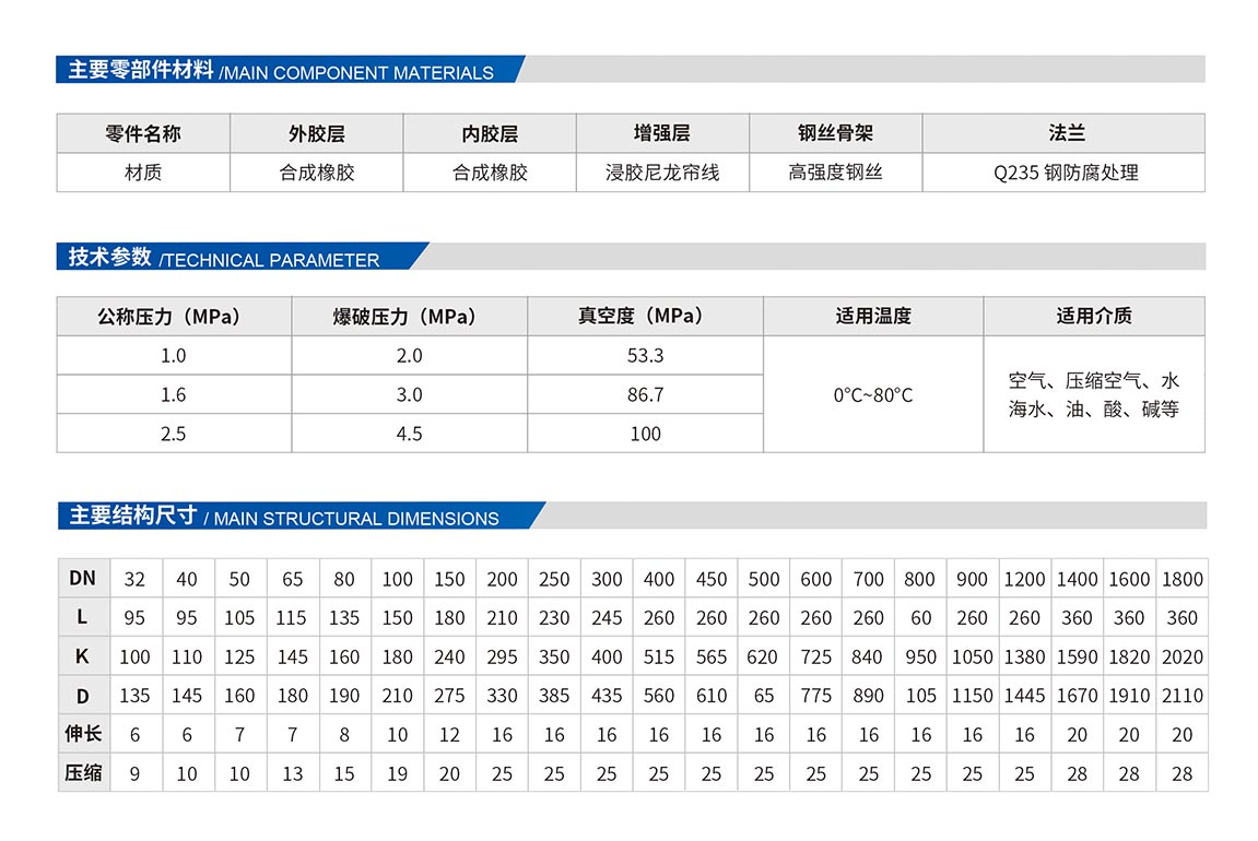 由織物增強(qiáng)的橡膠件,一般由內(nèi)膠層、織物增強(qiáng)層、鋼絲圈、外膠層經(jīng)硫化成橡膠件后與松套金屬法蘭組成,用于管道隔振降噪、補(bǔ)償位移的接頭。可補(bǔ)償軸向位移、徑向位移和角向位移。具有耐壓高、彈性好、位移量大、平衡管道偏差、吸收振動、降低噪音效果好。
